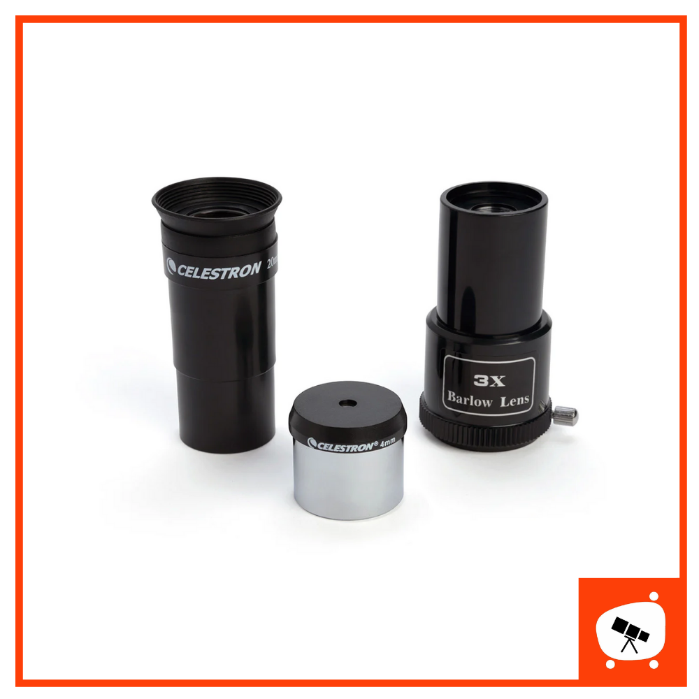 - Eyepiece: 4mm, 20mm. Eyepiece adalah lensa mata yang digunakan untuk melihat objek langit dan mendapatkan pembesaran dalam teleskop. Untuk menghitung pembesaran, bagi focal length dengan eyepiece. Misal 1.000/4 = 250 kali pembesaran.